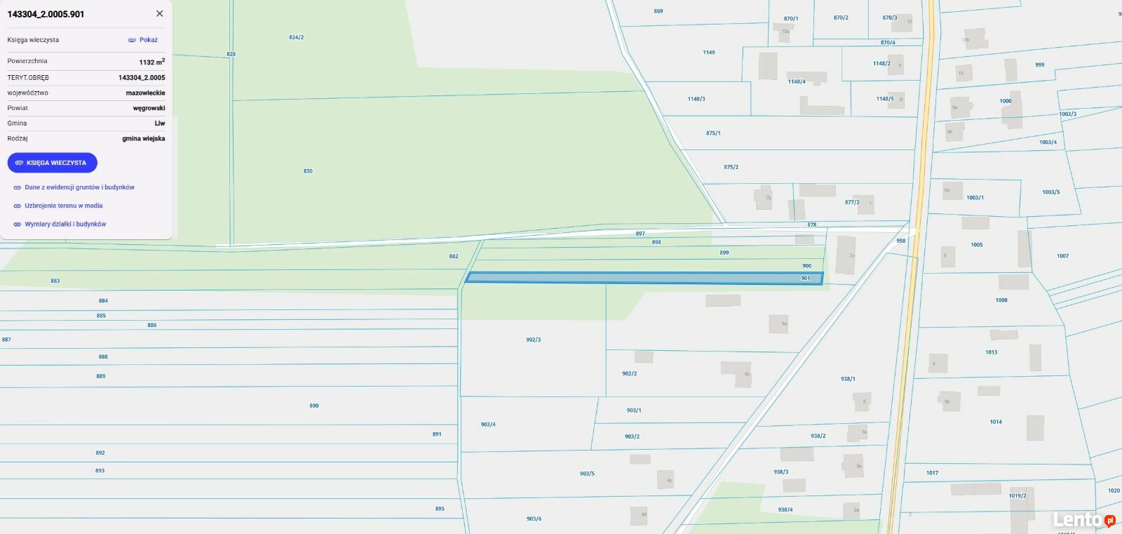 2. Działka nr 901- o powierzchni 1128 m2. Las sosnowy z drogą dojazdową. W okolicy działki budowlane.
